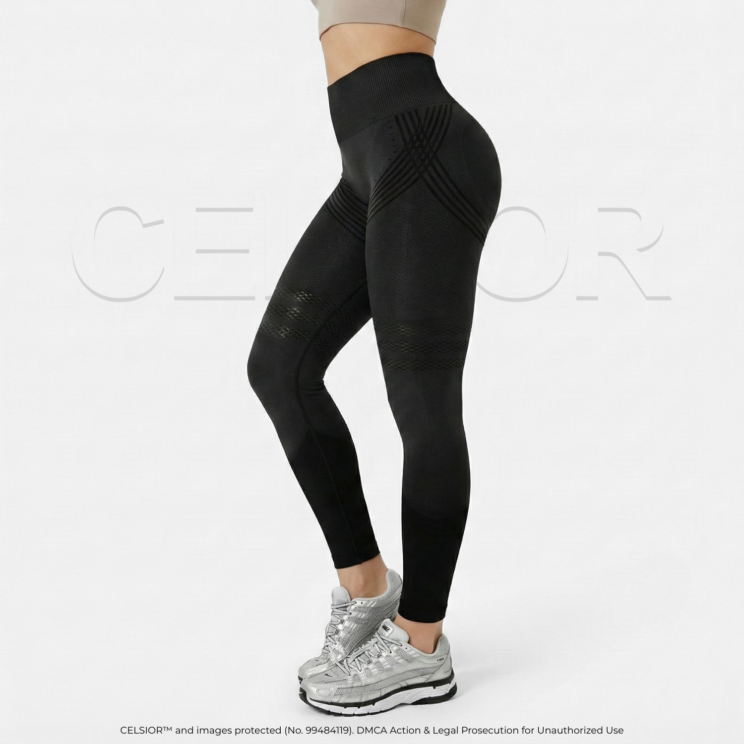 Our strategically placed 3D sculpting lines compress your thighs and glutes, boosting blood circulation by 30%. Improved circulation allows your body to more efficiently eliminate fat cells and toxins responsible for cellulite, addressing the root cause. Combined with our POWERCELLS™ compression, they also tone your legs, giving you firmer and more sculpted legs.